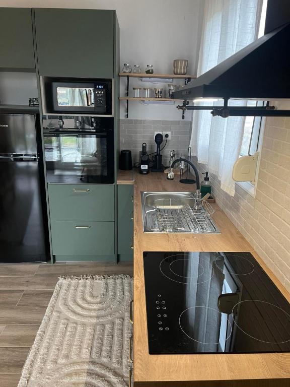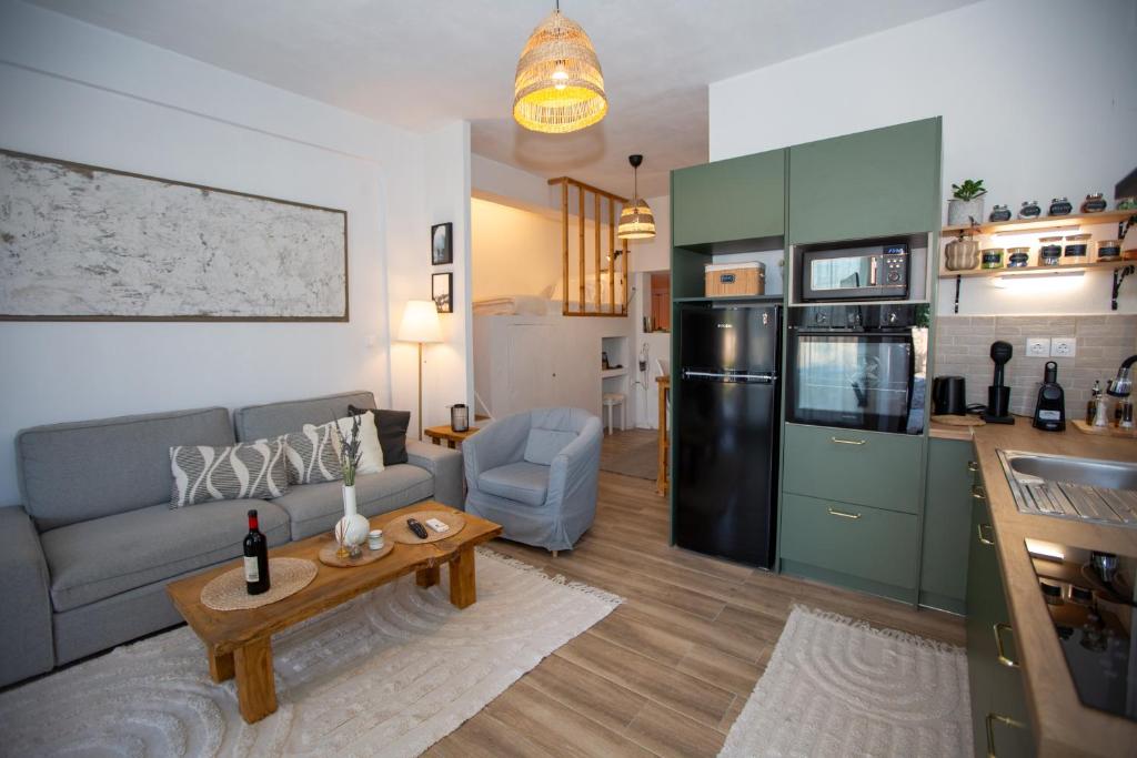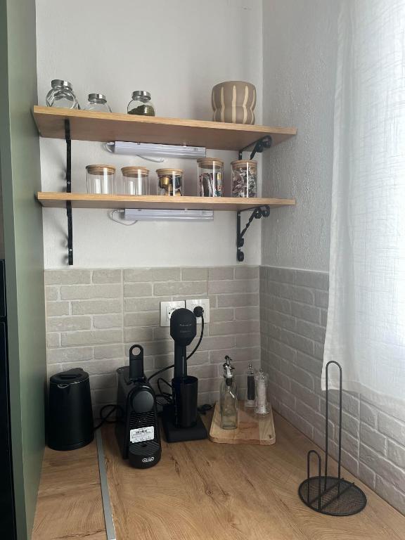 Η κουζίνα διαθέτει όλες τις απαραίτητες ηλεκτρικές συσκευές και σκεύη για την προετοιμασία γευμάτων, προσφέροντας τη δυνατότητα στους επισκέπτες να απολαμβάνουν το πρωινό ή το φαγητό τους στον άνετο χώρο του διαμερίσματος. Ο λειτουργικός σχεδιασμός της διευκολύνει την καθημερινή χρήση, ενώ ο εξοπλισμός καλύπτει όλες τις βασικές ανάγκες ενός σύγχρονου καταλύματος.
